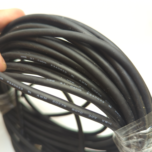 The cable is designed to be durable, with quality materials that help prevent wear and tear over time. The printed specifications on the cable (USB 3.1 3340033 AWM 20276 80°C 30V VW-1) reflect its build standards and safety rating.