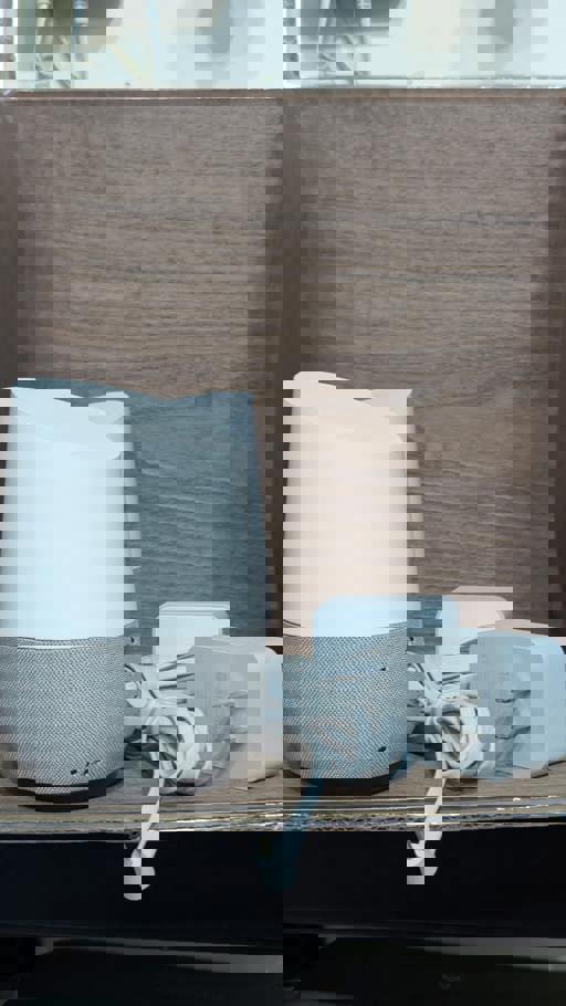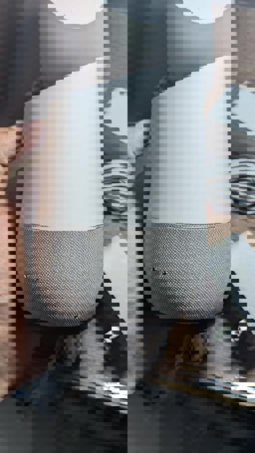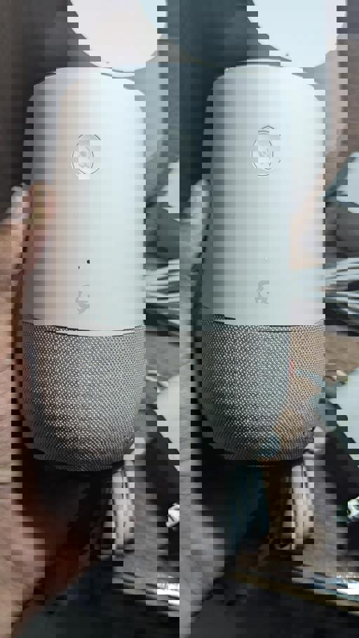 Introducing the Google Home smart speaker with Google Assistant in light grey and white. This used speaker is designed to seamlessly integrate into your home audio setup, providing hands-free access to music, news, and more. With its compact size, it's perfect for small audio setups. Enjoy the convenience of voice commands and the power of Google Assistant, all in one sleek device.