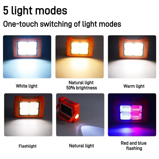 Adjustable lighting and four lighting modes With 336 LEDs and 100W of power, this rechargeable work light is perfect for camping, night work, and other dark activities. There are four light modes on the rechargeable LED work light: warm, white, and warm white with red, blue, and SOS warning lights.