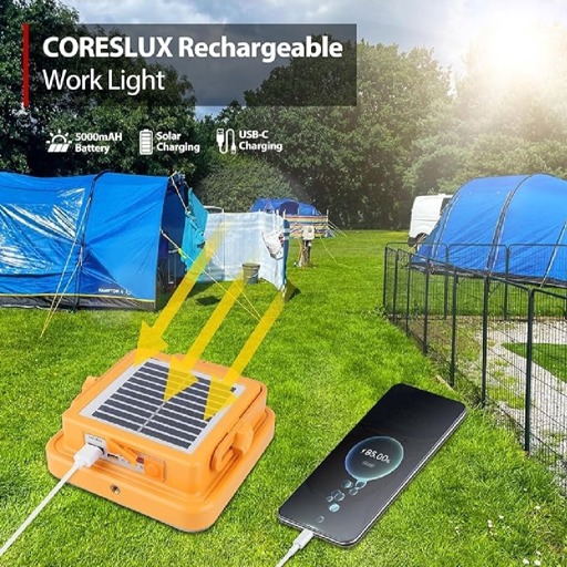 - LONG BATTERY LIFE and RECHARGEABLE FROM THE SOLAR: The solar work light has a solar panel on the back and a 12000mAh rechargeable battery. The portable work light features an energy-efficient USB input that can be charged with electricity as well as a solar panel that allows it to be charged during the day.