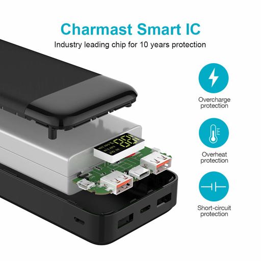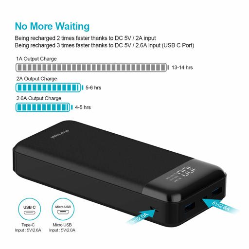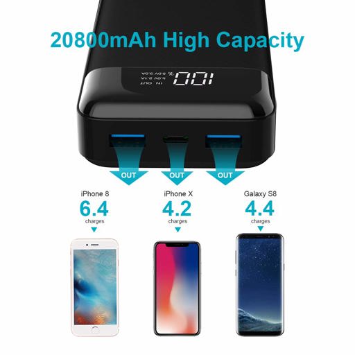 True huge 20800mAh battery bank charges an iPhone X for 5 times, a Galaxy S9 4.6 times, or an iPad mini 4 2.4 times; fully recharge in 8-11 hours with a 2A or 3A charger. Great for daily use or travel both. 5V/3A high speed charge your phones or tablets. Each single output port of this portable chargers max reach to 5V/3A, it has total 3 outputs, (2 USB-A outputs, 1 USB-C output). Compared with other's old version 5V/1A or 5V/2A, it is super fast charging your cell phones or tablets. Compatible with most of phones or tablets, just take this power bank with you anywhere, it supports to charge almost all of your cell phones and tablets. Great for family share battery powers or travelling. Convenient Digital LED Power Display Screen. LED power display screen will clearly show battery power level and total output current range 2.1A or 3.0A. (2.1A means current is equal to 2.1A or less than it. 3.0A means current is between 2.1A to 3.0A).