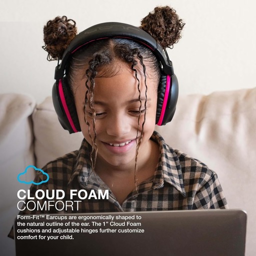 - CLOUD FOAM COMFORT: Form-Fit Earcups are ergonomically shaped to the natural outline of the ear. The 1” Cloud Foam cushions and adjustable hinges further customize comfort for your child.