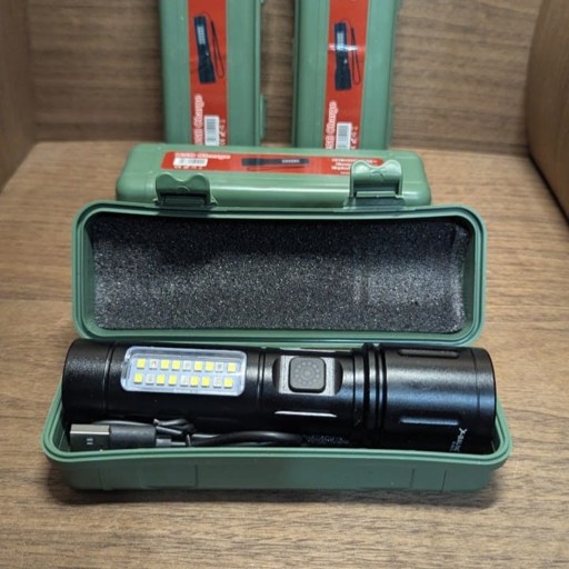 LED flashlight with 6 MODES, High, Middle, Flashing lighting, White, Red, Red Flash COB Light Modes, controlled with a single button, When a mode has been used for Half a minute, press the button once and the light will turn off, you can choose the focusing range from the floodlight to the spotlight by stretching the head of the flashlight. Floodlights are used for large-area lighting, and spotlights are used for long-distance lighting